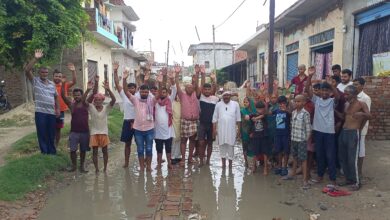बरही-बोगना गांव मार्ग पर प्राथमिक विद्यालय बरही के सामने बने गड्ढे में धान की रोपाई कर विरोध जताया