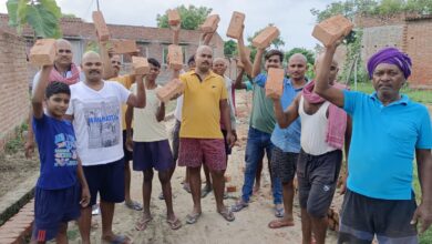 ग्रामीणों ने हाथ में ईट लेकर किया प्रधान व सचिव के खिलाफ प्रदर्शन