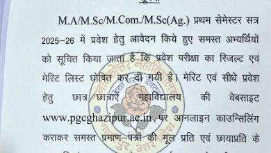 गाजीपुर।स्नातकोत्तर महाविद्यालय, गाजीपुर में सत्र 2025-26 के लिए स्नातकोत्तर (पीजी) प्रवेश परीक्षा का परिणाम घोषित कर दिया गया है।प्राचार्य प्रोफेसर…