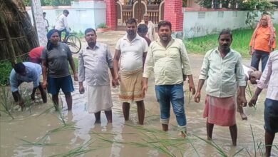 सड़क पर धान की रोपाई करके किया विरोध प्रदर्शन